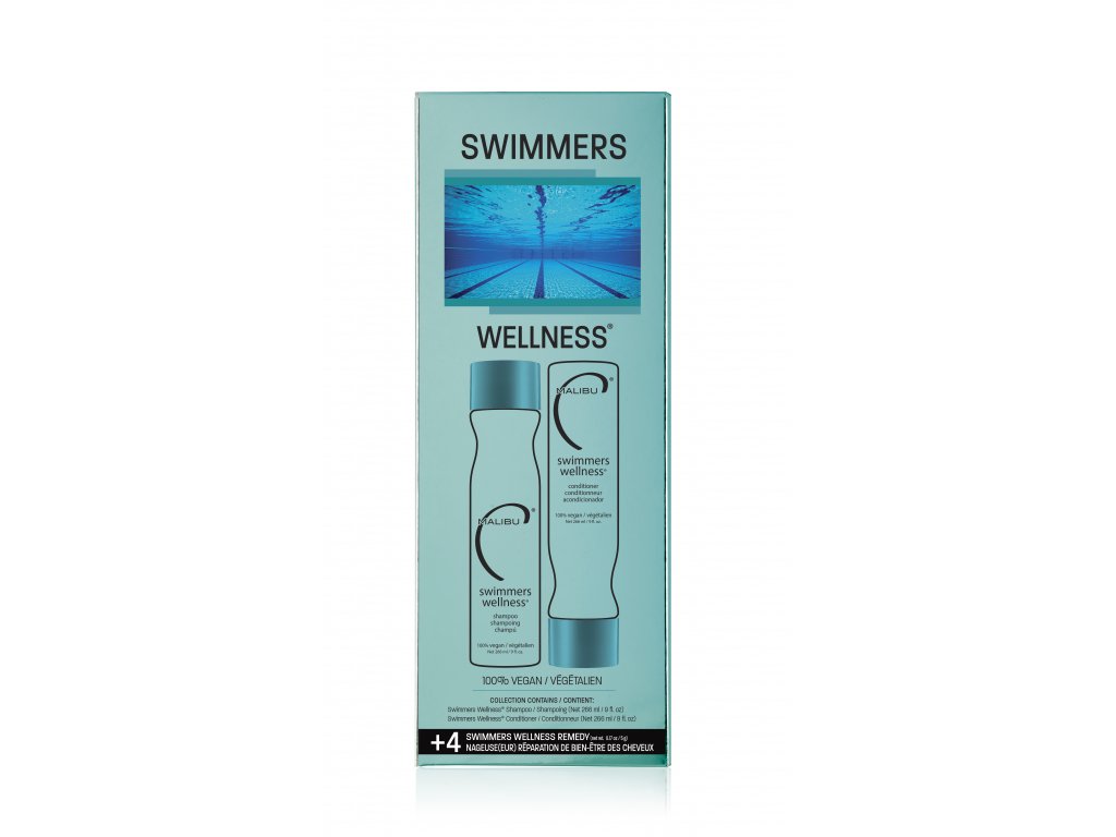 Sada od MalibuC vyživuje, posiluje a napomáhá chránit vlasy proti poškození a nežádoucím barevným tónům způsobených vodou z bazénu nebo moře. Odstraňuje také nánosy mědi, které tvoří nechtěné zelené odstíny. Přírodní proteiny vlasy posilují a dodávají vlasům pohyb a objem. Swimmers Wellness sáček obsahuje krystalický vitamín C, který aktivně a do hloubky čistí vlas a pokožku hlavy.